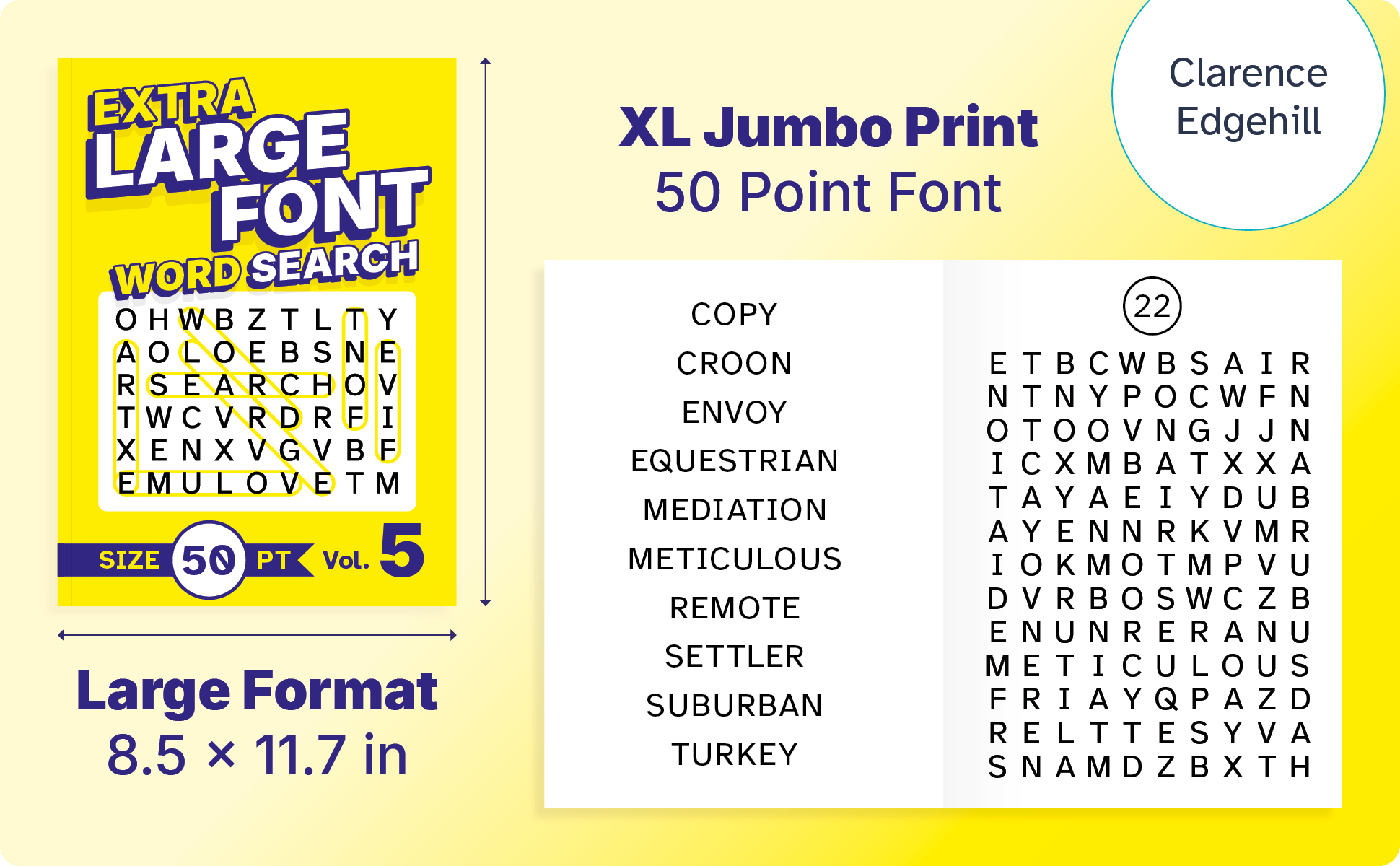 The fifth volume in the series features 50 engaging word search puzzles printed in a 50-point font – about three times larger than standard large print. Each spacious 8.5 × 11.7 inch page features a clean, uncluttered 10 × 13 grid with ten words to find, making solving clear and enjoyable. Perfect for seniors, low vision readers, and visually impaired puzzle fans, this book is ideal for relaxing at home, passing the time while travelling, or as a thoughtful gift. With oversized print and a straightforward layout, every puzzle is designed for accessibility and enjoyment.