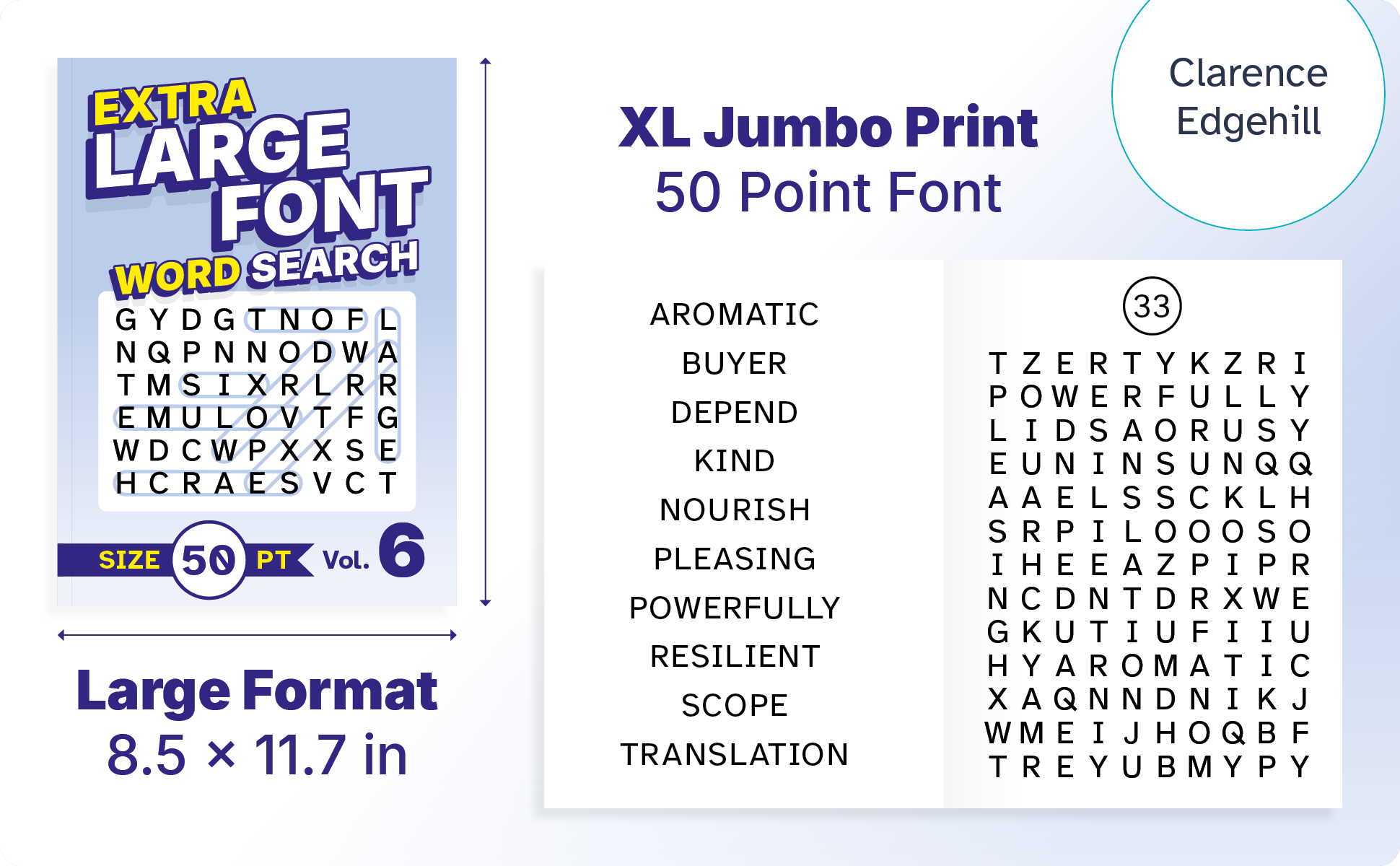 Discover 50 extra-large font word search puzzles designed for relaxation and enjoyment. Step into the sixth collection of 50 word search puzzles, each printed in a clear, 50-point font – almost three times the size of standard large print. The design prioritizes easy reading and comfort. The book’s layout, at 8.5 × 11.7 inches, offers a clean and uncluttered format. Each puzzle is set on a full-page 10 × 13 word grid with ten words to locate, making it straightforward and engaging. Ideal for relaxation, travel, or mindful leisure, this puzzle book is a great companion. It's also an excellent gift for anyone who enjoys puzzles and appreciates the benefits of a larger, more readable font.