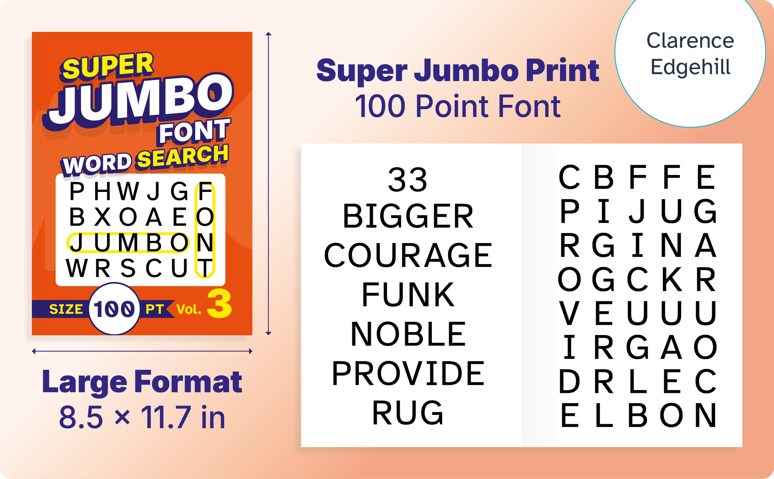 Explore a truly accessible puzzle collection with the Super Giant Print Word Search Edition. Each puzzle is printed in an enormous 100-point font, with oversized grids and word lists created specifically for solvers with low vision or visual impairments. At more than six times larger than standard print, this format offers exceptional clarity. The generous 8.5 × 11.7-inch pages and clean, open layout provide a comfortable, low-strain solving experience. Inside, you’ll enjoy 50 engaging word searches, each presented on its own page with a bold 6 × 8 grid and six clearly printed words to find.
